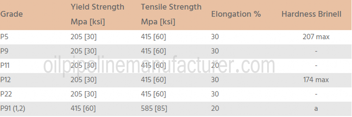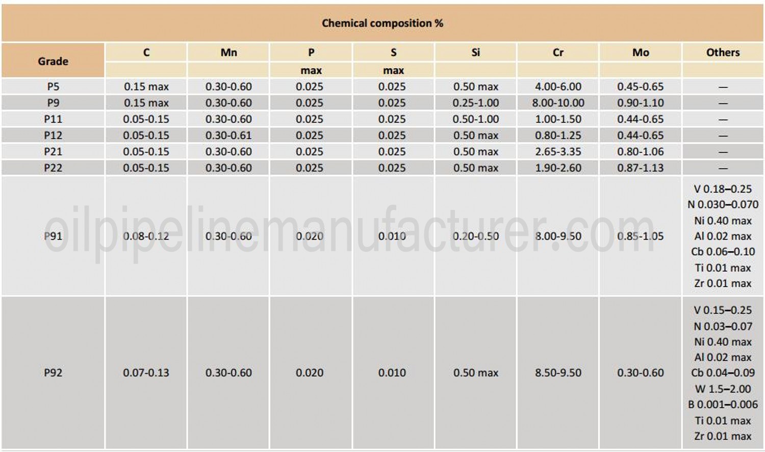 Grade P5, P9, P11, P22 and P91 pipe refer pipe fittings material in ASTM A234 WP5, WP9 ,WP11, WP22 WP91, where flange material in ASTM A182 F5, F9, F11, etc. They have similar chemical composition and mechanical properties.