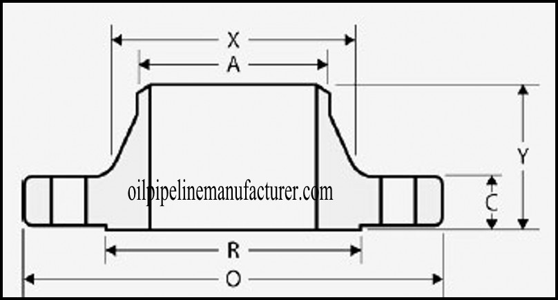 | Nominal Pipe Size | Outside Diam. of Flange (O) | Thick. of Flange (C) | Diam. of Raised Face (R) | Diam. of Hub at Base (X) | Diam. of Hub at Point of Welding (A) | Length thru Hub (Y) | No. of Holes | Diam. of Holes | Diam. of Bolts | Diam. of Bolt Circle | Approx. Weight (in Pounds) |